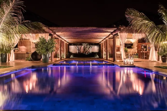 Equipamentos de LED RGB de últica geração submersíveis, estrategicamente instalados, criam cenários e jogos de luz personalizáveis. A iluminação técnica ao entorno da piscina destaca linhas contemporâneas e proporcionam uma experiência visual única durante a noite.