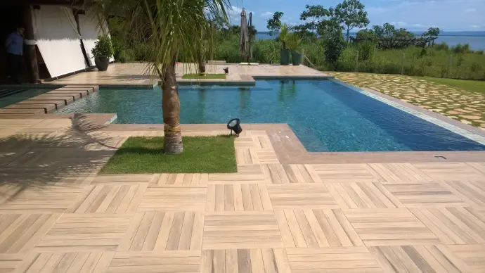 Versatilidade Estética: A pedra Hijau combina perfeitamente com outros materiais de alto padrão, como decks de madeira, muros em pedra natural e iluminação subaquática em LED, criando um ambiente luxuoso e personalizado.